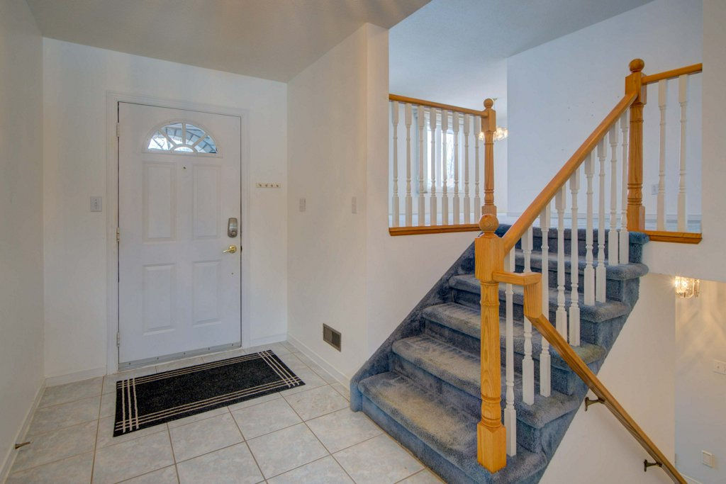 The main level includes a generously sized eat-in kitchen, featuring abundant cupboards and a ceramic backsplash with undermount lighting. The “L” shaped living and dining room are off the kitchen and main foyer.