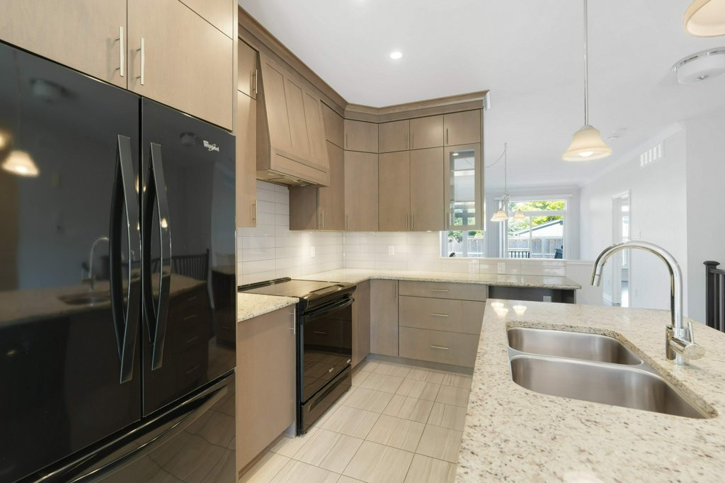 Step inside through a stained-glass entry door into a bright foyer with soaring ceilings and gleaming hardwood floors. The open-concept main level is flooded with natural light, featuring a spacious living and dining. The kitchen showcases granite counters, a central island, subway tile backsplash, microwave shelf, ample cabinetry, and a charming breakfast nook. The primary suite offers a peaceful retreat with a walk-in closet and 3-piece ensuite, complete with an oversized vanity and glass-door shower.